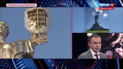 Юрий Афонин указал на символическое значение перемены гербов на самом известном монументе Украины. Советский герб – сугубо мирный. Колосья символизируют созидательный труд и изобилие, серп и молот – союз рабочих и крестьян, земной шар – мир во всем мире, дружбу народов, ленты с надписью «Пролетарии всех стран, соединяйтесь» на 15 языках – солидарность трудящихся. А тризуб чаще всего трактуется как оружие. Да, это древний символ, восходящий к личным знакам некоторых князей династии Рюриковичей. Но, сказал Юрий Вячеславович, свастика до Гитлера тоже была всего лишь безобидным древним символом солнца. Однако после Гитлера она – символ чудовищных преступлений и человеконенавистнической идеологии. Так и с тризубом. Он был эмблемой гитлеровских пособников – украинских коллаборационистов, которые под началом немцев сожгли вместе с жителями Хатынь и сотни других деревень, а также учинили Волынскую резню и огромное множество других злодеяний. Уже поэтому после этого никакое нормальное государство не стало бы использовать тризуб как свой герб.