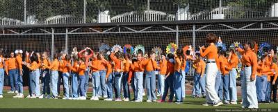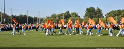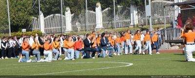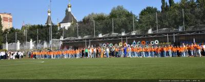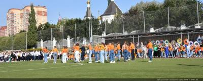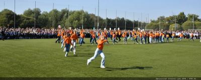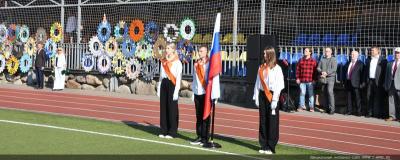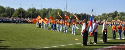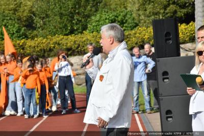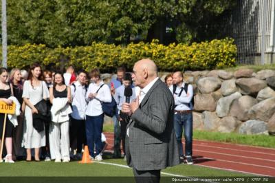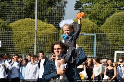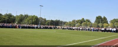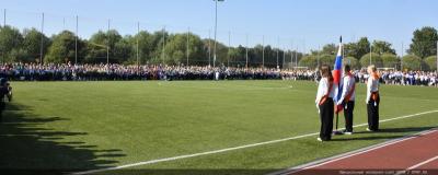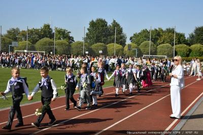 Вначале Г.А. Зюганов выступил на торжественной линейке на открытом спортивном стадионе возле здания школы:
