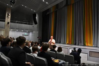 Затем лидер российских коммунистов в актовом зале школы провел открытый урок Мира. На урок пришли учащиеся старших классов. Геннадий Андреевич рассказал о своей учительской семье, и о том, как он начинал свою трудовую деятельность в 17 лет учителем математики, физкультуры и военного дела в сельской школе. Рассказал о семейном увлечении пчеловодством. Рассказал о личных спортивных достижениях в молодые годы и об успехах спортивного клуба КПРФ. Команда КПРФ по мини-футболу стала абсолютным чемпионом России.