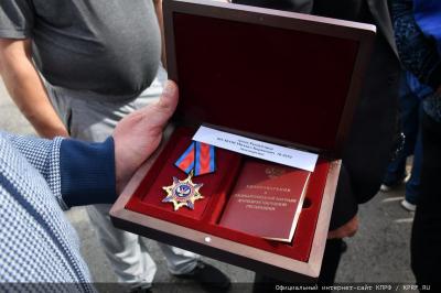 Затем из рук Первого секретаря МК КПРФ Николая Васильева партийные медали получили коммунисты Ленинского ГК КПРФ – Сергей Белоус и Сергей Белинский.