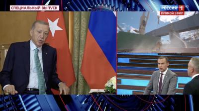 Одной из тем обсуждения в эфире программы стал визит в Россию турецкого президента Эрдогана. Юрий Афонин выразил мнение, что ожидания от этого визита у СМИ и ряда экспертов были, очевидно, завышенными – в частности, по поводу возможного возобновления зерновой сделки. В этих прогнозах не учитывался такой фактор: Эрдоган не может говорить ни от имени Запада, ни от имени Киева. Сделка может быть возобновлена только после выполнения всех требований России, но другая сторона – и прежде всего Запад – пока к этому не готова. Эрдоган и рад бы посодействовать, так как сделка очень выгодна для Турции, но это не в его силах.