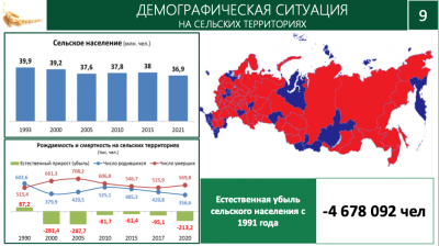 Второе, о чем хочу сказать в декабре 2022 года, мы скорректировали стратегию развития агропромышленного комплекса, исходя из поручений Президента, и помимо главной задачи в устойчивом росте АПК не менее 3% в год, одной из важных задач является сбережение сельского населения и развитие села. Вы можете посмотреть, что в некоторых Округах, в том числе аграрных за 15 лет сельское население уменьшилось до 13%.