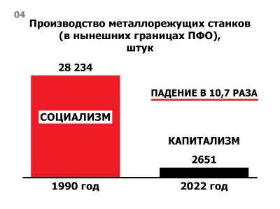 Давайте сначала посмотрим, что произошло при капитализме с промышленностью Поволжья (слайд 3). Выплавка стали в регионах ПФО сейчас почти в два раза меньше, чем в конце советской эпохи. Еще больше пострадало машиностроение (слайд 4). Мы видим, как обрушилось производство металлорежущих станков, а ведь свои станки – это важнейшая составляющая настоящей независимости государства. Они необходимы, в том числе, для оборонной промышленности. А у нас в течение последних десятилетий твердили, что можно просто завезти станки из-за рубежа. Но в условиях действия более чем 10 тысяч антироссийских санкций, в условиях настоящей гибридной войны возрождение отечественного станкостроения является ключевой задачей.