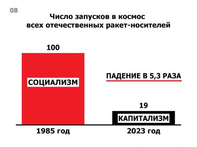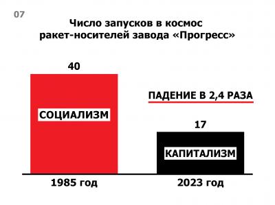В советскую эпоху в Поволжье развивались самые современные и наукоемкие производства, в том числе авиационно-космическая отрасль. Одной из важнейших основ советской космонавтики были ракеты-носители «Союз», производимые куйбышевским заводом «Прогресс». В частности, именно с их помощью осуществлялись все пилотируемые полеты (слайд 7). Мы видим, что в 2023 году этих ракет-носителей было запущено в два с половиной раза меньше, чем в 1985 году, то есть почти 40 лет назад. Космическая отрасль сейчас имеет исключительно важное значение. В частности потому, что боевые действия на Украине обеспечиваются огромным объемом данных спутниковой разведки. И с нашей стороны, и со стороны Запада, помогающего киевскому режиму. Для обеспечения этой разведки и спутниковой связи нужна очень мощная спутниковая группировка. Можно сказать, что СВО идет сейчас в том числе в космосе. Поэтому давайте посмотрим и на состояние космической отрасли в масштабах всей страны. К сожалению, эта отрасль подошла к нынешним историческим испытаниям, мягко говоря, не в лучшей форме (слайд 8). Если число запусков ракет-носителей, производимых в Самаре, упало в два с половиной раза в сравнении с 1980-ми годами, то всех отечественных ракет-носителей – в 5 раз. Нашим главным противником и тогда, и сейчас являются США (слайд 9). Но в 1980-е годы СССР пятикратно превосходил Соединенные Штаты по числу космических запусков. Советский Союз фактически господствовал в околоземном космосе. А если мы посмотрим на данные 2023 года (слайд 10), то увидим обратное соотношение: США более чем в 5 раз опережают Россию по числу запусков.