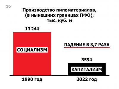 Северная часть Поволжья богата лесом. Прежде всего – Пермский край и Кировская область. Но при капитализме очень сильно пострадала лесопереработка (слайд 16). Производство пиломатериалов в регионах ПФО упало почти в 4 раза. Нормой при капитализме стал вывоз леса за рубеж в виде совершенно необработанного кругляка.