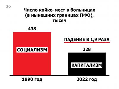 Конечно, деградации в годы капитализма подверглась и социальная сфера Поволжья (слайд 26). Например, число мест в больницах региона сократилось почти в 2 раза.