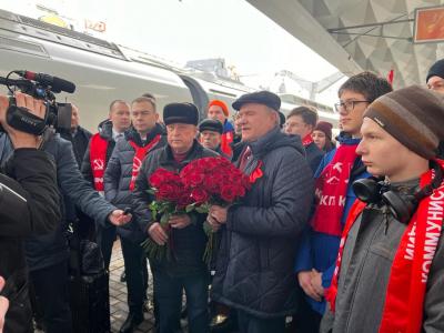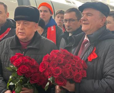 На Московском вокзале делегацию встретили коммунисты Санкт-Петербурга и Ленинградской области во главе с первыми секретарями региональных отделений Р.И. Кононенко и В.А. Царихиным. Гостей города трех революций приветствовали лозунгами: "Зюганов! Партия! Победа!", "За Харитонова!".