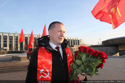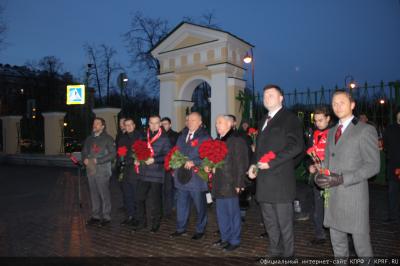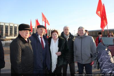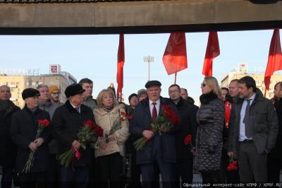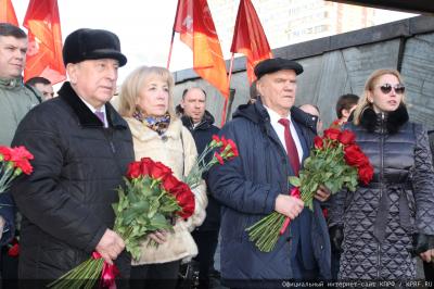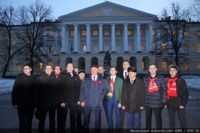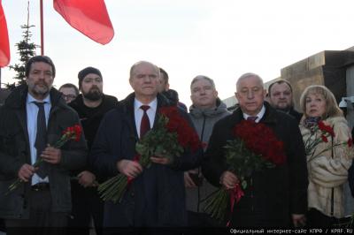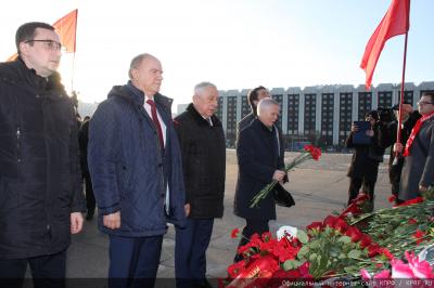 Второй день рабочего визита делегации ЦК КПРФ начался с возложения цветов к памятнику В.И. Ленину у здания Смольного.