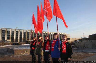 Активисты КПРФ и ЛКСМ РФ приветствовали участников торжественной церемонии скандированием лозунга: "Зюганов! Партия! Победа! За Харитонова!".