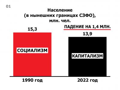 Одной из бед, принесенных капитализмом, стал демографический кризис. С 1990 года население тех регионов, которые сейчас входят в СЗФО, сократилось на 10% (слайд 1). Это значительно более высокий уровень демографических потерь, чем по России в целом. Из 11 регионов СЗФО за годы капитализма население сократилось в 8 регионах. Население Петербурга и прилегающих районов Ленинградской области выросло. В то же время подавляющая часть регионов перенесла жестокую депопуляцию. Пять регионов СЗФО потеряли за годы капитализма более 30% своего населения. А Мурманская область, которая является важнейшей и с точки зрения будущего экономического развития страны, и с военно-стратегической точки зрения, лишилась с 1990 года 44% жителей, то есть почти половины населения! Для сравнения: за последние 30 лет Советской власти население Мурманской области более чем удвоилось.