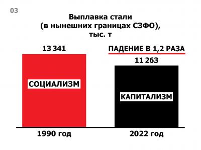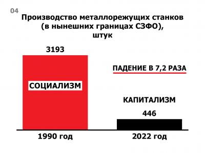 Юрий Афонин привел данные по нынешнему состоянию некогда высокоразвитой промышленности Северо-Запада России. Выплавка стали в СЗФО на 20% меньше, чем в годы социализма (слайд 3). Но черная металлургия – это первый передел сырья, а наиболее сокрушительный удар российский периферийный капитализм нанес по промышленности более высоких переделов, по наукоемкой и высокотехнологичной индустрии. Специализацией Северо-Запада России в советское время было прежде всего разнообразное высокотехнологичное машиностроение. Что с ним стало? Вот пример: производство металлорежущих станков в регионах СЗФО сегодня в 7 раз меньше, чем при социализме (слайд 4). А ведь собственные станки – важнейшая основа технологического суверенитета страны. Поэтому на встрече с премьером Мишустиным Геннадий Андреевич Зюганов поставил вопрос о выделении дополнительных средств на развитие отрасли. Эти средства были выделены, но быстро преодолеть допущенный при капитализме обвал станкостроения, к сожалению, невозможно.