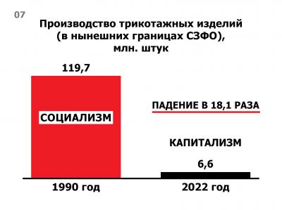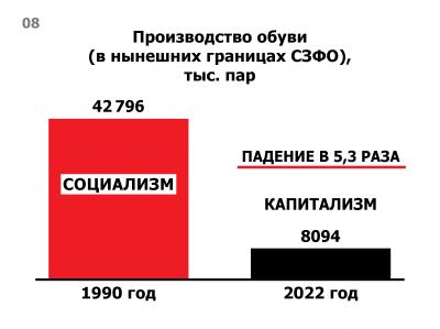 Глубокий упадок при капитализме пережила и легкая промышленность. Например, в 18 раз сократилось производство трикотажных изделий (слайд 7), в 5 раз упало производство обуви (слайд 8).
