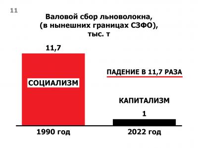 В регионах СЗФО в сравнении с 1990 годом почти втрое сократились посевные площади (слайд 9). В 2 раза меньше собирается картофеля (слайд 10). Специализацией сельского хозяйства Северо-Запада было выращивание льна. Однако при капитализме параллельно с упадком текстильной промышленности сбор льноволокна сократился почти в 12 раз (слайд 11).