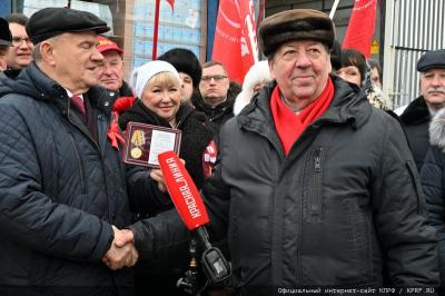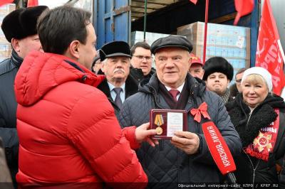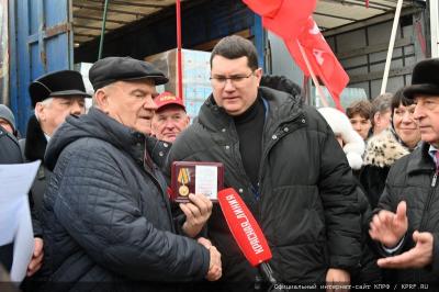 Затем были вручены медали от Министерства обороны РФ «За вклад в укрепление обороны Российской Федерации» Денису Сергеевичу Сидорову (первый секретарь, Рязанский обком КПРФ), Павлу Николаевичу Грудинину (директор ЗАО «Совхоз им. Ленина»), Алексею Александровичу Лебедеву (первый секретарь, Тульский обком КПРФ), Антону Сергеевичу Сидорко (первый секретарь, Владимирский обком КПРФ), Сергею Юрьевичу Белоусу (Ленинский ГК КПРФ), Сергею Вадимовичу Белинскому (Ленинский ГК КПРФ), Юрию Степановичу Волконитину (первый секретарь, Каширский ГК КПРФ), Людмиле Владимировне Лебедевой (председатель Королёвского отделения МОО ООО «Дети войны»). Также за успешную активную работу и постоянное участие в формировании и отправке гумконвоев была вручена Грамота директору ФИЦ картофеля имени А.Г. Лорха, первому секретарю Люберецкого ГК КПРФ Василию Аркадьевичу Бызову.