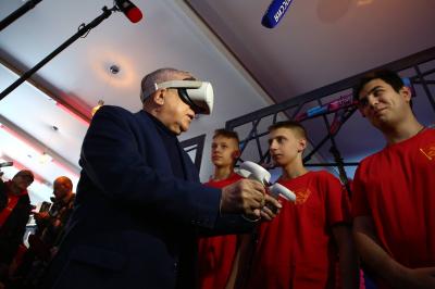 Николай Михайлович поприветствовал команды, рассказал о поддержке КПРФ молодого вида спорта, познакомился с новыми разработками российских компьютерных игр и поучаствовал в создании виртуальной космической ракеты в VR очках.