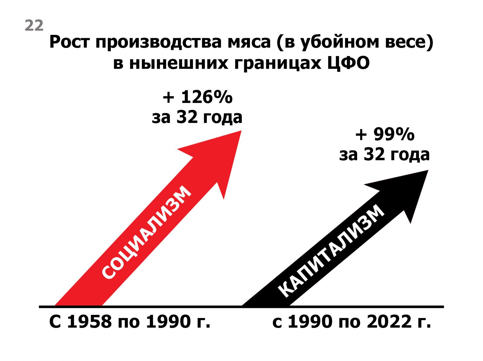 Ситуация в животноводстве тоже неоднозначна. Наибольшим достижением является рост производства мяса (слайд 21): в 2 раза по сравнению с 1990 годом. В большинстве регионов страны ситуация обратная. Например, в Сибирском федеральном округе производство мяса сейчас в полтора раза меньше советских показателей. Но даже в ЦФО рост производства мяса при капитализме меньше, чем рост его производства за аналогичный по длительности период советской эпохи (слайд 22). В советское время развитие мясного животноводства шло быстрее.