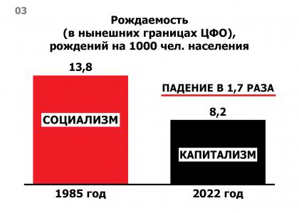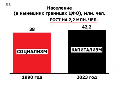 Особенности ЦФО отражают и демографические тенденции (слайд 1). В четырех федеральных округах, которые команда кандидата КПРФ уже посетила, налицо значительное сокращение населения за годы капитализма. А вот в Центральном федеральном округе оно выросло. Этот рост не является быстрым. В советское время население регионов, которые сейчас входят в состав ЦФО, росло намного быстрее (слайд 2). За 32 года капитализма население ЦФО увеличилось на 2 миллиона 200 тысяч человек. А за предшествующие 32 года социализма прирост совокупного населения этих регионов составил 4 миллиона 600 тысяч человек. Но все-таки рост населения при капитализме в ЦФО тоже есть.