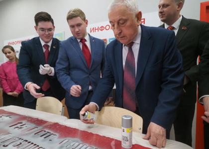 Затем Николай Харитонов принял участие в уроке «Знамя нашей Победы», который провели первые секретари Свердловского областного и Екатеринбургского городского комитетов комсомола Денис Курочкин и Виталий Озеров. При помощи трафаретов и специальных средств старшие наставники вместе с детьми изготовили собственное Знамя Победы - точную копию штурмового флага №5, который держали в руках бойцы Берест, Егоров и Кантария.