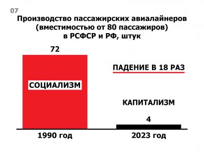 В 2023 году выпуск пассажирских авиалайнеров в России оказался в 18 раз меньше, чем в РСФСР в 1990 году (слайд 7). В результате резкого сокращения производства самолетов при капитализме сегодня ситуация с российским авиапарком вызывает большую тревогу. На начало 2024 года 16 российских авиаперевозчиков имеют 730 лайнеров. Из них 600 – западного производства (то есть более 80%) и только 130 отечественных. Причем отечественные лайнеры – только ближнемагистральные: это «Сухие Суперджеты» и совсем старые Ан-24, иным из которых уже более 50 лет. А средне- и дальнемагистральные лайнеры – все западные. В совокупной пассажировместимости доля западных самолетов – более 90%.