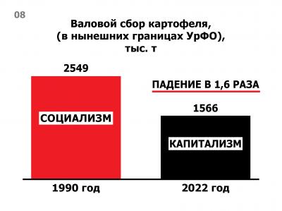 Затем Юрий Афонин перешел к характеристике сельского хозяйства УрФО. Известно, что в последние годы в стране наметился определенный подъем в некоторых сельскохозяйственных отраслях. В частности, много говорится о рекордных сборах зерна. Однако к Уралу это не относится. В УрФО даже рекордный урожай зерновых 2022 года оказался примерно на 5% ниже, чем урожай советского 1990 года. Сборы других культур сократились значительно больше. Например, сборы картофеля сегодня в полтора раза меньше, чем в конце советской эпохи (слайд 8).