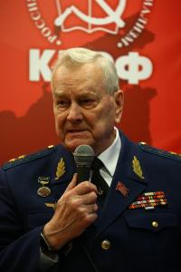 Затем слово взял Председатель Центрального Совета Международного Союза советских офицеров, генерал-лейтенант авиации Г.М. Бенов. Геннадий Матвеевич рассказал присутствующим о принятой Союзом офицеров резолюции о своей поддержке кандидата от КПРФ.