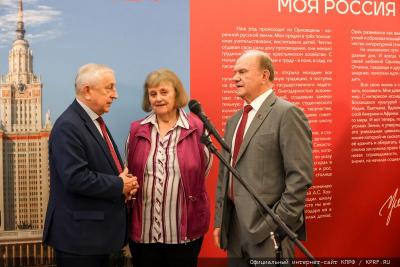 Ведущий акцентировал внимание на том, что один из разделов выставки называется «Россия. Родина. Народ». Эти слова отражают политическое кредо Г.А. Зюганова и стали лозунгом в ряде избирательных кампаний.