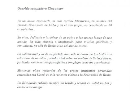 26 июня президент Кубы Мигель Диас-Канель Бермудес провёл телефонный разговор с лидером КПРФ Г.А. Зюгановым, а также направил ему поздравительную телеграмму: