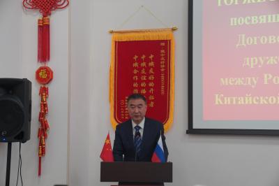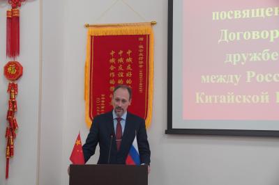 «Уважаемый Полномочный министр Чжан Вэй! Уважаемые гости! Дорогие друзья! Рад приветствовать всех собравшихся на нашем традиционном мероприятии, посвященном Договору о добрососедстве, дружбе и сотрудничестве между Российской Федерацией и Китайской Народной Республикой.