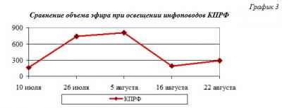Таким образом, Экономический форум 22 августа освещался дольше, чем Партсобрание 16 августа, но меньше, чем отправка 127 Гумконвоя и поездка Г.Зюганова в Орёл (график 3).