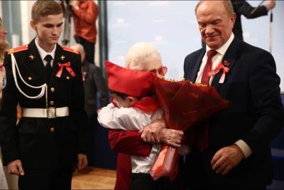 С приветственным словом к присутствующим обратились: Председатель ЦК КПРФ Геннадий Андреевич Зюганов, участница Сталинградской битвы, участница Курской битвы, боев под Прохоровкой, форсирования Днепра Мария Михайловна Рохлина, Иван Сергеевич Баграмян, внук дважды Героя Советского Союза, Маршала Советского Союза Ивана Христофоровича Баграмяна.