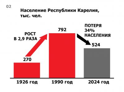 Республика Карелия (слайд 2). За советские годы население выросло в 3 раза, а за годы капитализма потеряно 34% населения. Отмечу, что в России законом закреплено понятие «Арктическая зона Российской Федерации» с установлением перечня территорий, которые к этой зоне относятся. В Карелии к этой зоне принадлежит не вся республика, а 6 муниципалитетов. Так вот на арктических территориях Карелии за годы капитализма потеряна ещё большая доля населения – 45%.