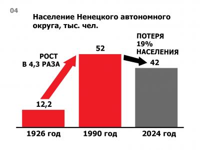 Ненецкий автономный округ (слайд 4). В советскую эпоху – рост населения более чем в 4 раза. За годы капитализма потеряна почти пятая часть населения.