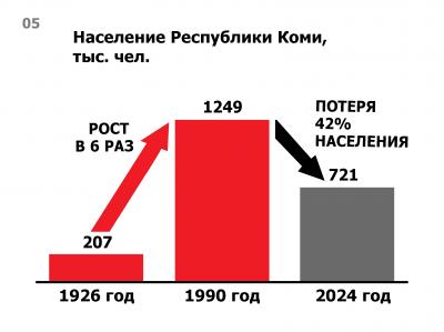 Республика Коми (слайд 5). За советские годы – рост населения в 6 раз. За годы капитализма – потеря 42% населения. А на самых северных территориях республики, которые отнесены к арктической зоне, ситуация намного хуже: здесь при капитализме потеряно более 60% населения.