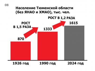 Тюменская область без автономных округов (слайд 8). Рост населения в полтора раза в советское время, увеличение населения на 20% в период капитализма. Эти 20% – тоже, конечно, следствие действия углеводородной ренты.