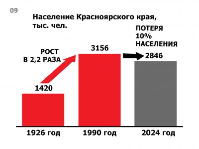 Красноярский край (слайд 9). Рост населения в 2,2 раза в советские годы и сокращение населения на 10% при капитализме. Но на тех территориях, которые отнесены в этом регионе к арктической зоне, потери населения гораздо больше: север Красноярского края потерял за годы капитализма 36% своего населения.