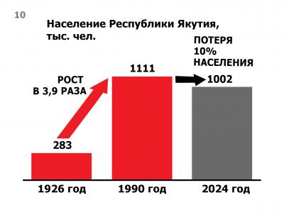 Республика Саха Якутия (слайд 10). При социализме – рост населения в 4 раза, при капитализме – потеря 10% населения. Что касается тех территорий республики, которые отнесены к арктической зоне, здесь депопуляция ещё гораздо более резкая: потеряно более половины населения, нынешние жители – это лишь 44% от населения конца советской эпохи.