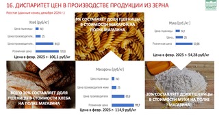 Сегодняшние расчёты показывают, что если фермер сдаёт зерно по 13 рублей за килограмм, а из него получается 2–2,5 батона хлеба, то их стоимость должна составлять 26 рублей. Однако на полках магазинов цена выше 100 руб.