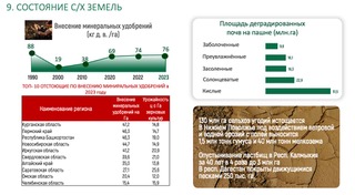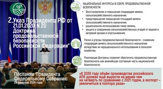 Особое внимание стоит уделить земле. Я хочу показать второй слайд по нумерации. Посмотрите, что говорит президент. Вот 2020 год, указ от 21 января, обращение президента 2024 года, а также тема продовольственной безопасности. Особое внимание уделено земле. Президент говорит о бережном отношении к сохранению земель сельхозназначения, сохранению плодородия почв и затрагивает целый ряд вопросов, которые могут быть полезны для нас. А в своем обращении он подчеркивает необходимость увеличения производства на 25% и экспорта на 50%. В условиях войны эта поддержка имеет особое значение.