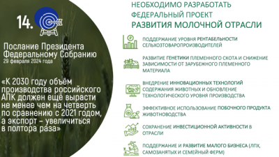 Наша задача — добиться создания федерального проекта по животноводству. Без этого невозможно обеспечить страну собственным молоком. Сегодня на одного человека приходится всего 220 кг молока в год, в то время как норма — 320 кг. Мы даже свои базовые потребности не закрываем!