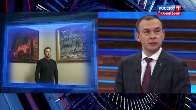 Мы также будем укреплять эти связи и вместе продолжать антифашистскую борьбу, сказал Юрий Вячеславович. Он обратил внимание зрителей на картины, на фоне которых позирует в своем кабинете Зеленский: горящий Кремль, горящий Мавзолей. Это же воплощение их фашистских нарративов: Кремль – это великая история Руси-России, Мавзолей – символ великой советской эпохи, они хотели бы сжечь дотла и то, и другое. Яркая иллюстрация того, что русофобия и антисоветизм идут рука об руку.