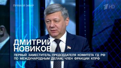 Предваряя ответ на поставленный вопрос, Дмитрий Новиков поблагодарил Первый канал и другие СМИ за освещение Второго международного антифашистского форума, проведённого в Москве Коммунистической партией Российской Федерации: «К нам приехали гости из 91 страны – в два раза больше, чем на первый форум два года назад в Минске. Было представлено 160 организаций – национальных и международных. В их числе Ассоциация антифашистов, Всемирная федерация демократической молодёжи и ряд других. Они представляли, в том числе, и страны НАТО».