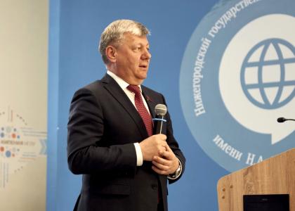 Во встрече участвовали представители двух вузов – Нижегородского государственного лингвистического университета им. Н.А. Добролюбова (НГЛУ) и Национального исследовательского Нижегородского университета им. Н.И. Лобачевского (ННГУ). Представив гостя, и.о. ректора НГЛУ Н.В. Авралёв передал слово для выступления Д.Г. Новикову.
