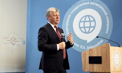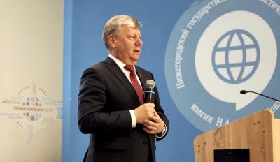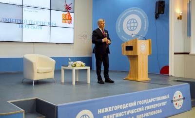 Во встрече участвовали представители двух вузов – Нижегородского государственного лингвистического университета им. Н.А. Добролюбова (НГЛУ) и Национального исследовательского Нижегородского университета им. Н.И. Лобачевского (ННГУ). Представив гостя, и.о. ректора НГЛУ Н.В. Авралёв передал слово для выступления Д.Г. Новикову.