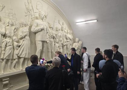 Воссозданный барельеф, торжественное открытие которого состоялось 15 мая, в день 90-летия Московского метрополитена, стал значимым событием, приуроченным также к 80-летию Победы в Великой Отечественной войне. Оригинальная композиция, созданная скульпторами Евгенией Блиновой и Павлом Баландиным, украшала станцию с 1950 года, однако в 1965 году, барельеф заменили на панно с Лениным, а через год и вовсе демонтировали из-за строительства перехода.
