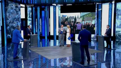 Участники программы «Время покажет» предположили, что за протестами стоят западные кураторы. Дмитрий Новиков назвал очень удачными оценки нынешних протестов в Киеве как «картонного майдана». Это верно не только потому, что многие плакаты в руках протестующих нарисованы на картоне, но и по сути своей, пояснил он: «На Украине сегодня всё картонное – майдан, политика, демократия, которой похваляется Зеленский».