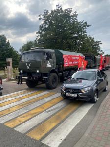 Завершение автопробега ознаменовалось торжественным развертыванием увеличенной копии Знамени Победы и отправкой 141-го гуманитарного конвоя КПРФ для участников СВО, собранного совместными силами коммунистов со всего Северного Кавказа. На сегодняшний день КПРФ направила на Донбасс уже 141 гумконвой – это более 27 тысяч тонн продовольствия, медикаментов, спецтехники, строительных материалов. Казбек Тайсаев подчеркнул, что первый конвой гуманитарной помощи Донбассу был направлен в июне 2014 года именно из Ставропольского края силами партийных организаций Северного Кавказа. Казбек Куцукович особо отметил, что в СКФО сложился очень сплоченный коллектив – все партийные организации Кавказа дружно, плечом к плечу работают во благо нашей Родины.