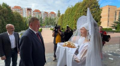 По давней университетской традиции высоких гостей у центрального входа встречали ректор вуза Елена Николаевна Правдина вместе с педагогическим составом. Почетного выпускника приветствовали хлебом-солью, что подчеркнуло глубокое уважение и теплоту встречи.
