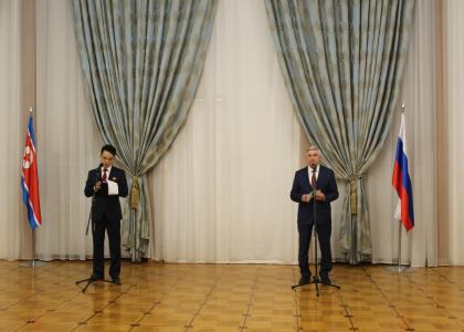 Завершая, от всей души поздравляю всех нас с 77-ой годовщиной со Дня основания Корейско-Народной Демократической Республики и предлагаю поднять бокалы за лидеров наших стран – Владимира Путина и Ким Чен Ына, за здоровье и благополучие дипломатов Посольства КНДР и всех присутствующих, за развитие нашей дружбы!».