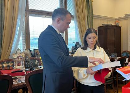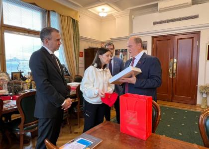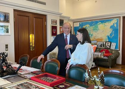 Председатель ЦК КПРФ Г.А. Зюганов встретился в Государственной Думе с военкором Первого канала И.Ю. Куксенковой. Во встрече также приняли участие первый заместитель Председателя ЦК КПРФ Ю.В. Афонин, являющийся наставником Ирины в проекте «Лидеры России. Политика», и секретарь ЦК КПРФ А.А. Ющенко.