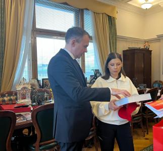 В завершение встречи Геннадий Андреевич вручил гостье памятные подарки, в числе которых - мед, собранный с пасек пчеловодов - участников СВО. Обложку подарочного медового набора, посвященного 80-летию Победы, украшает изображение боевого самолета, приобретенного для фронта в годы Великой Отечественной войны на личные средства саратовского пчеловода, председателя колхоза "Стахановец" Ферапонта Головатого.